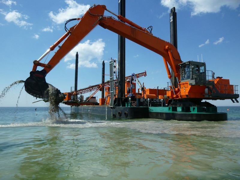 Backhoe dredger "BOULDER" Newly built in 2010, modified for excavator in 2011 Hull: 50.4 m x 12.0 m x 2.5 m Excavator : Hitachi EX 1200/6 weight class 120 ton Boom: 11.5 m Arms: 7.0 m and 5.3 m Buckets: 5.5 m3 and 5.2 m3 Max dredge dept 17 m Class: Certified by Finnish Transport Agency (TRAFI) for tow in international waters June 2011 – Hitachi EX 1200 excavator is mounted on pontoon “Boulder” In June 2011 Wasa Dredging completed the modification of the drilling pontoon “Boulder”. The pontoon was extended by an excavator foundation of 10 meters. On the foundation a special built 120 tons Hitachi EX 1200 excavator was mounted. “Boulder” is now used both for drilling and for dredging, thus reducing the economics of mobilization. Maximum dredge level is -17 meter, using is bucket of 4 m3, whereas dredging using an 6 m3 bucket can reach up to -14 meter.