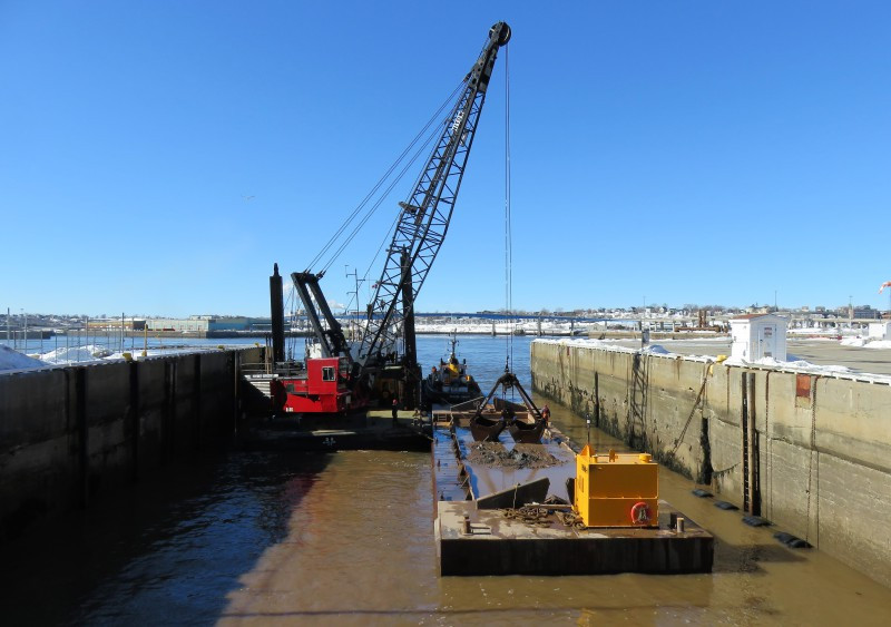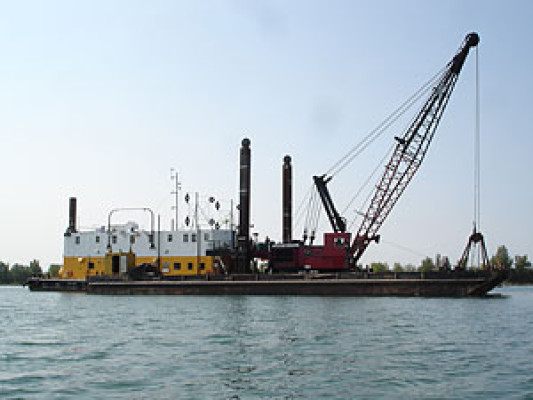 Irving dredge D 6 dredging in the St Lawrence Seaway above the Champlain bridge at the turning basin number 1 in Brossard Quebec, seen here Oct, 6, 2006. 1103hrs, alongside the dredge is the Irving tug Irving Chestnut.