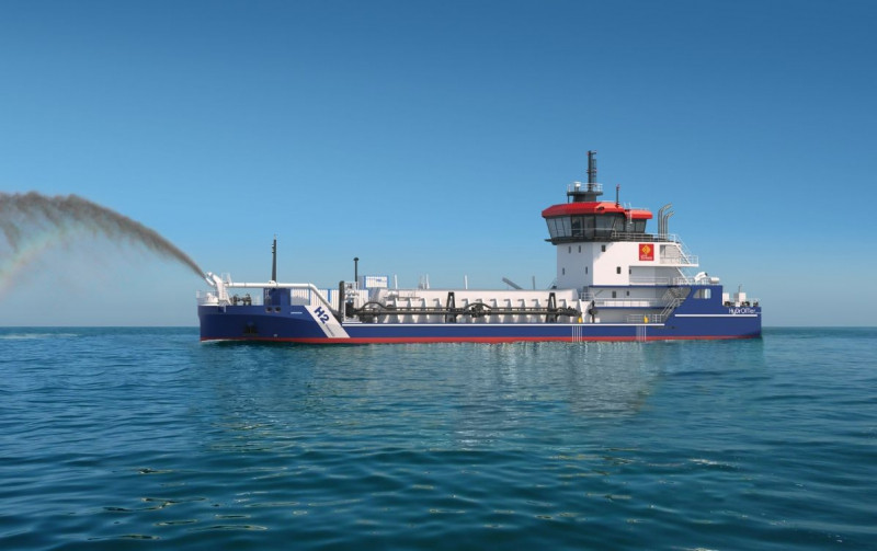 • A comfortable and aesthetically pleasing vesselThe crew accommodation includes ten individual cabins of respectable size, soundproofed, airconditioned, with the capacity to accommodate an additional four people. The accommodation is arranged on three levels and the elevated and forward wheelhouse provides a 360° view of the water and dredging equipment. The lines of the vessel are sleek, in order to combine elegance with the robustness and constraints of a working vessel. The dredger will carry the Region’s livery, with an H2 marking as a reminder of its hydrogen capabilities.